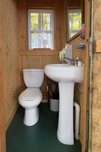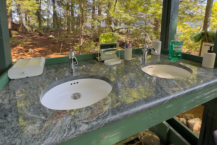 Enjoy meals in the cabin kitchen or gather around the twenty-foot communal picnic table designed for long, unhurried dinners. Smaller picnic tables and quiet eating spots are scattered across the island, offering places to dine alone by the water, share lunch on a sun-warmed rock, or stretch out on the soft island floor with something simple and good. There is no single dining area. Only choices.